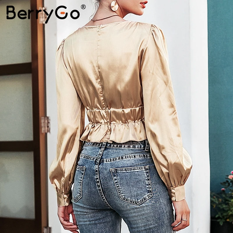 Special Offer BerryGo seksowna dekolt w serek satynowa bluzka damska koszula bufiaste rękawy potargane guziki bluzki damskie w stylu Vintage wysokiej talii damskie jesienne bluzki Discount 44% Today!