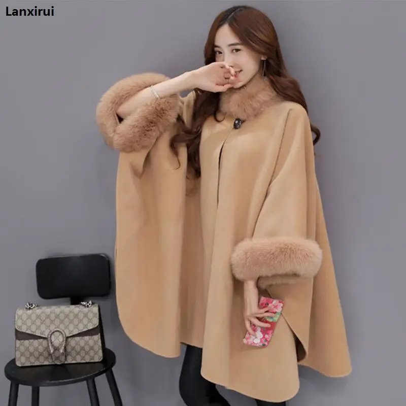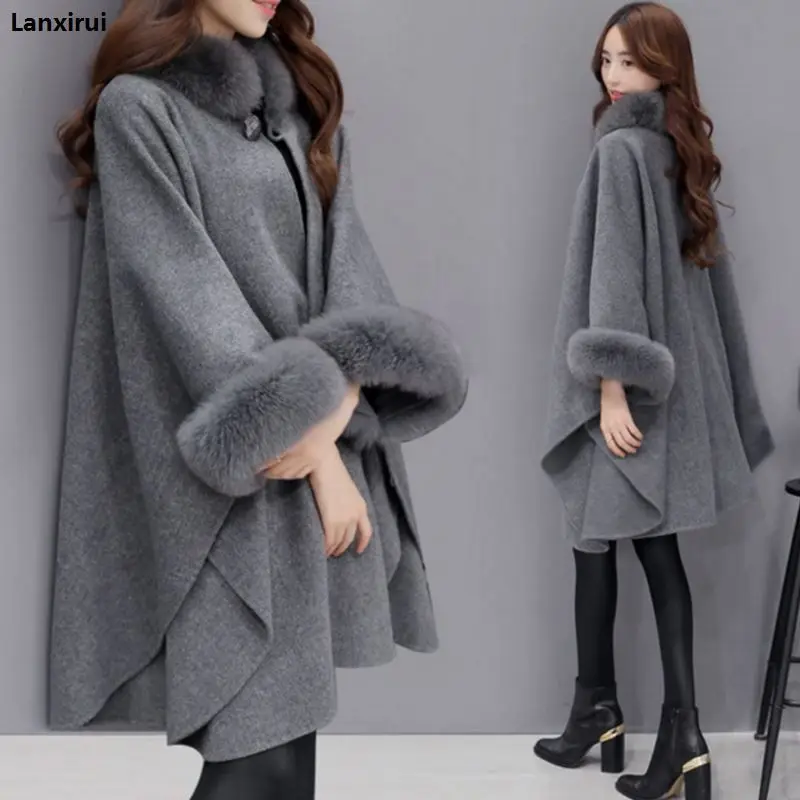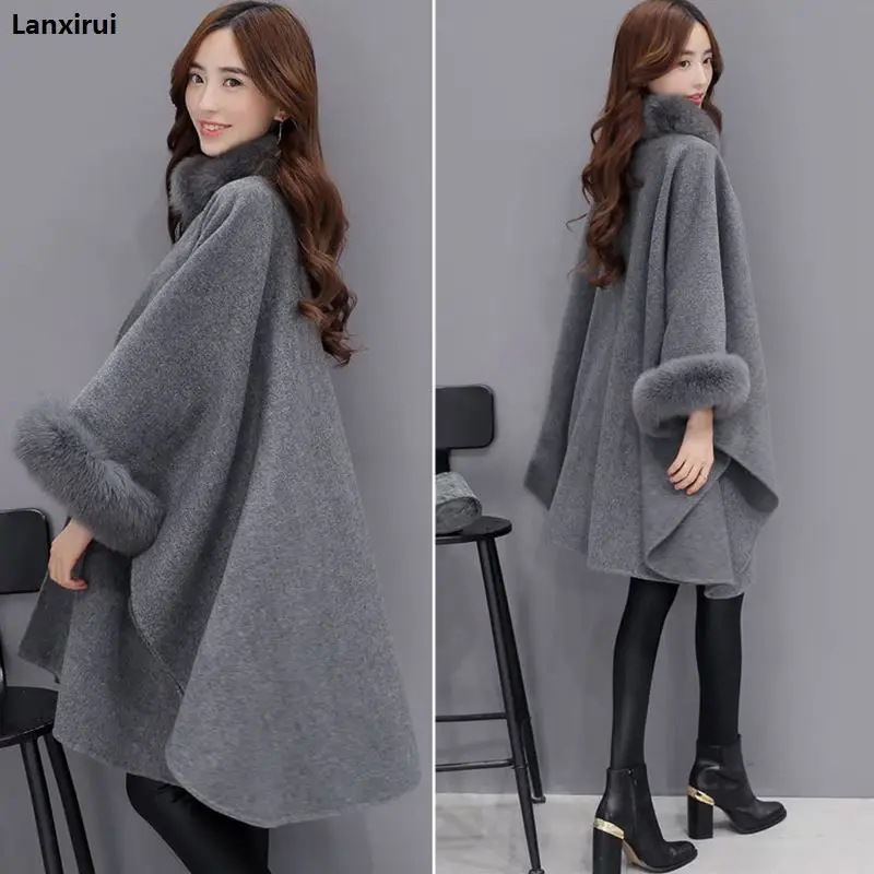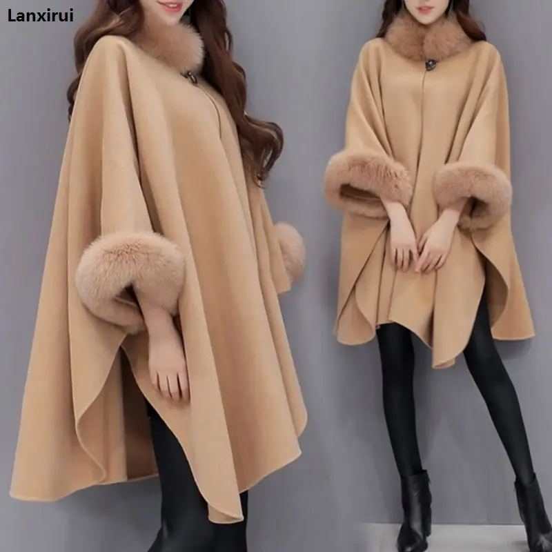 Special Offer Poncza i peleryny kobiety moda świąteczna Flare rękaw Faux kołnierz z futra lisa zimowy wełniany płaszcz peleryna Poncho długi płaszcz Discount 8% Today!