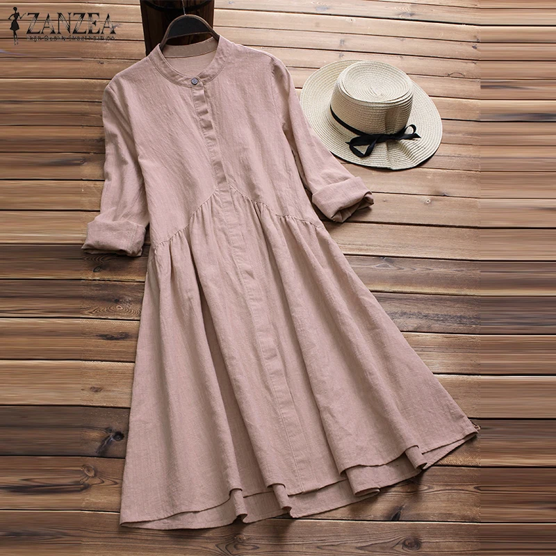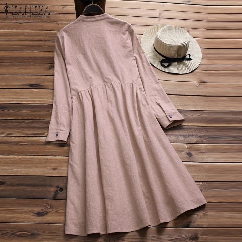Special Offer ZANZEA damska sukienka z dolnymi guzikami elegancka dama bawełniana pościel Vestido kobieta stójka sukienki szata Femme Sundress Plus rozmiar Discount 41% Today!
