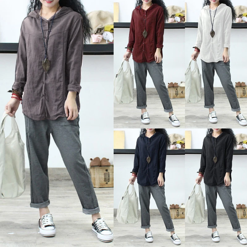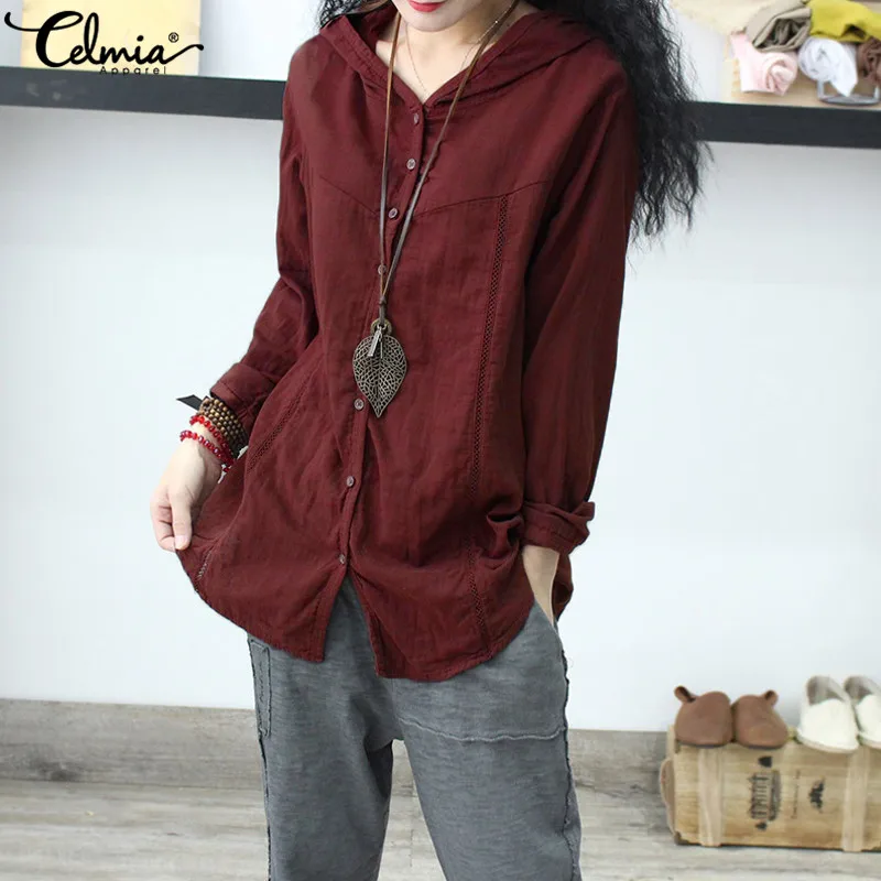Special Offer 5XL Celmia kobiety bluzki z kapturem w stylu Vintage lniane topy 2019 jesień dorywczo luźne przyciski koszule z długim rękawem Plus rozmiar Blusas Feminina Discount 40% Today!
