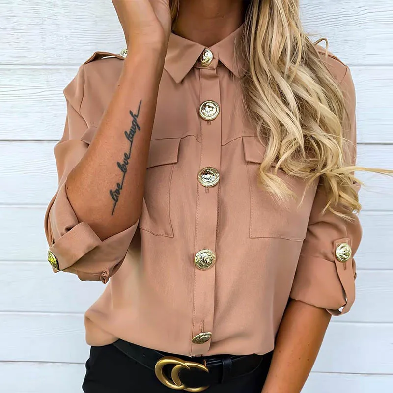 Special Offer Biustonosz Lady solid z kieszeniami zapinane na guziki bluzka koszule damskie casual trun down collar jesienne topy damskie nowe regulowane koszule z długim rękawem Discount 40% Today!