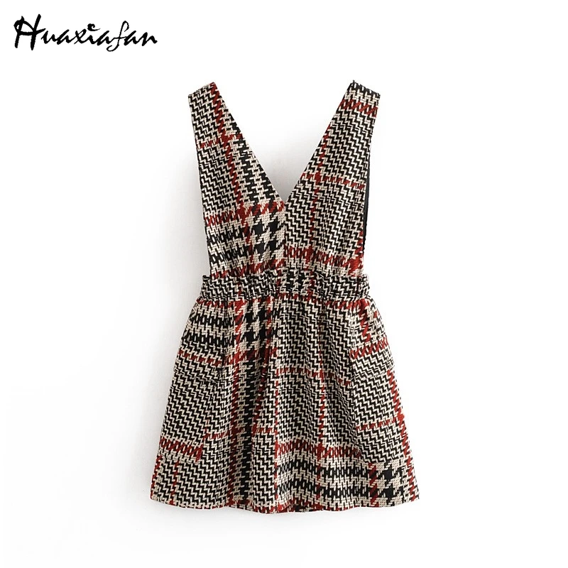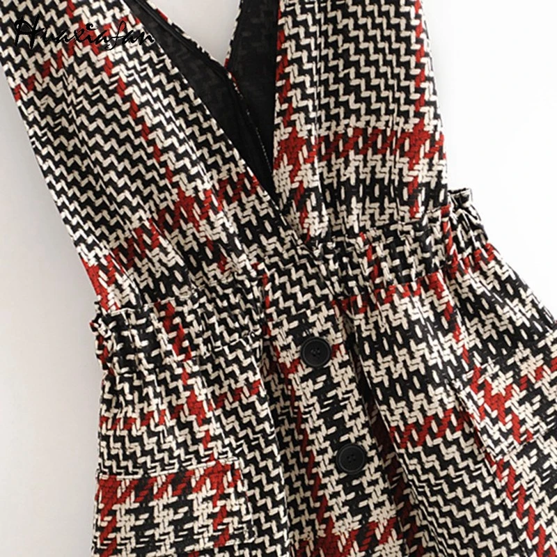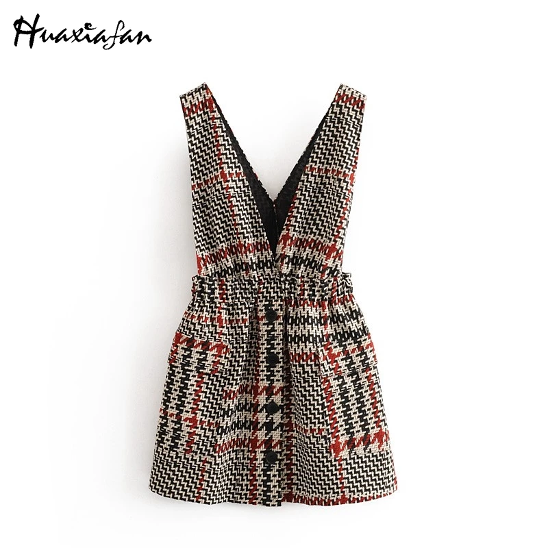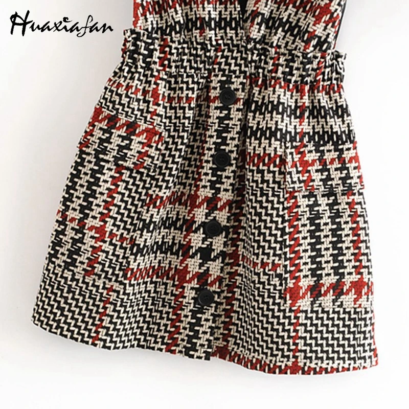 Special Offer Huaxiafan kobiety zimowa kamizelka sukienka Plaid Houndstooth głęboki dekolt w szpic z guzikiem kieszeń kobiety Mini sukienka wysoka elastyczna talia kamizelka do sukienki es Discount 61% Today!