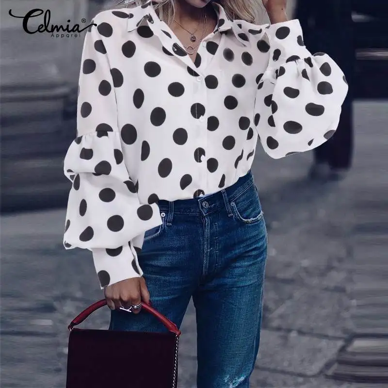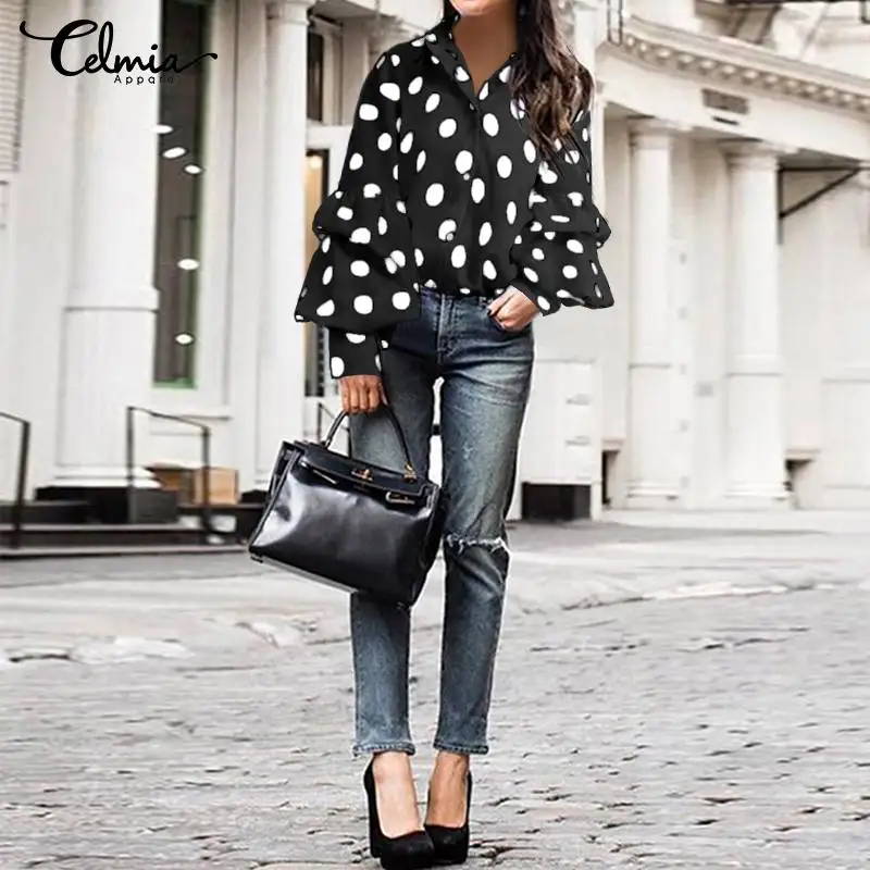 Special Offer Damska koszula z rękawami typu lampion Celmia 2019 jesień elegancka bluzka w kropki skręcić w dół kołnierz luźne Blusas Mujer Plus rozmiar góry Discount 40% Today!
