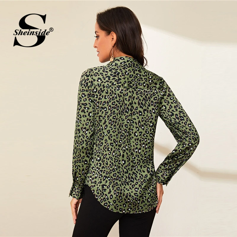 Special Offer Sheinside zielony Casual Leopard drukuj przycisk w górę bluzka kobiety 2019 jesień zaokrąglona krawędź bluzki damskie eleganckie druku wykończenia Top Discount 45% Today!