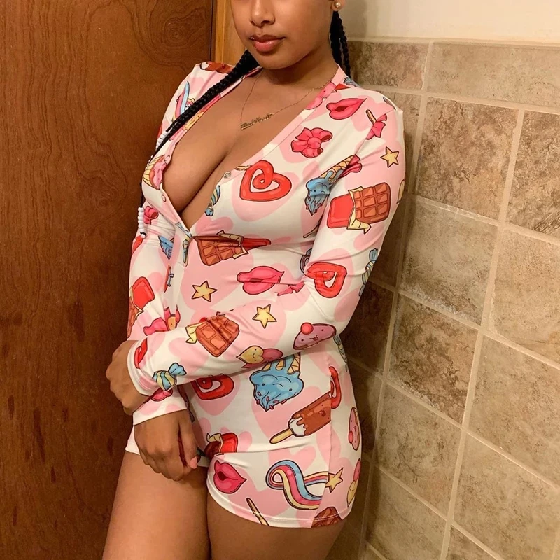 Special Offer OMSJ kobiety Cartoon wydrukowano z długim rękawem Plunge V neck sen Bodycon Romper Slim Fit Stretch Sexy lato Slim Fit płaszcza Playsuits Discount 30% Today!
