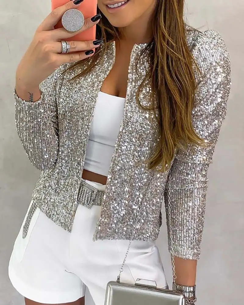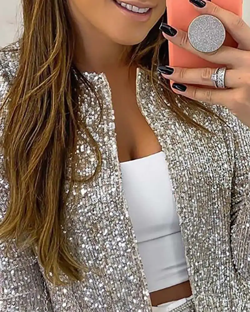 Special Offer Z długim rękawem otwórz przód cekinowy płaszcz kobiety dorywczo kurtka damska cekiny perły guziki płaszcz O Neck odzież zewnętrzna panie Discount 40% Today!