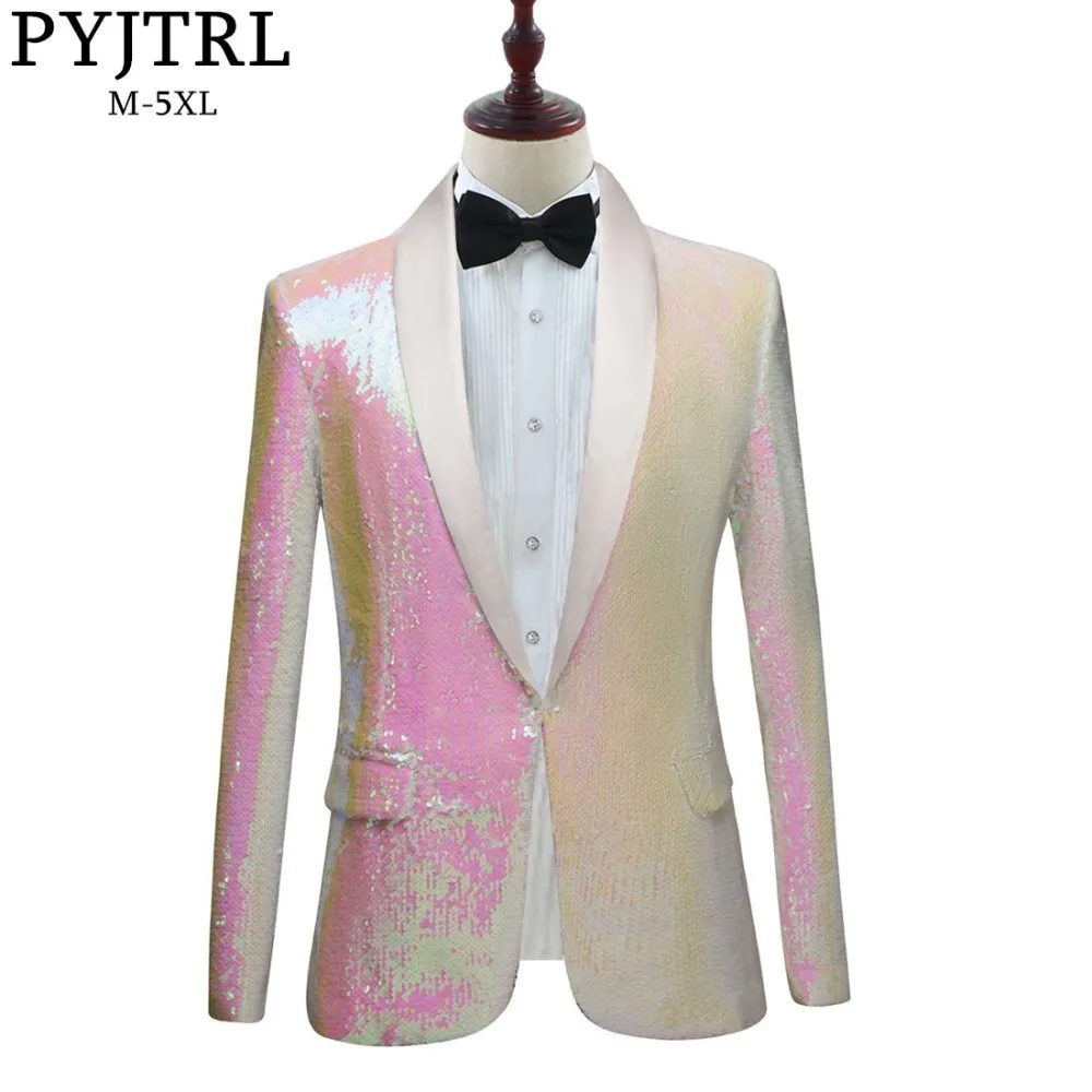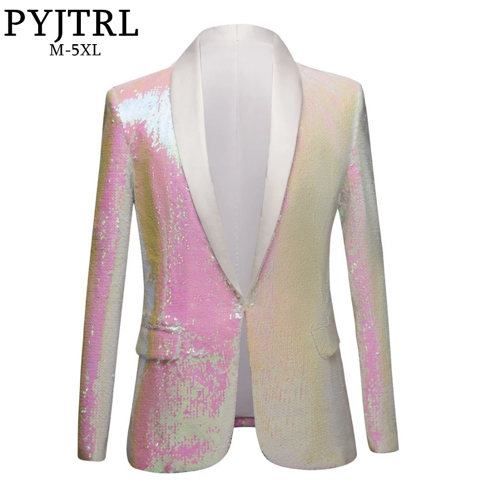Special Offer PYJTRL nowych mężczyzna czysty biały różowy cekiny szal Lapel Blazers Gentleman sukienka na studniówkę marynarkę nocny klub piosenkarki Slim Fit kostium Discount 50% Today!