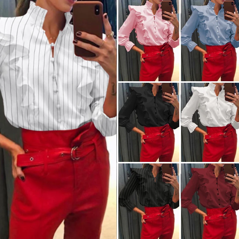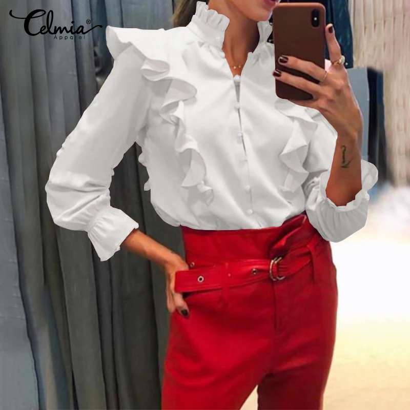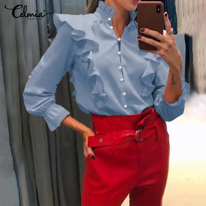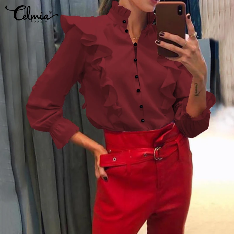 Special Offer Stylowe topy damskie bluzki z długim rękawem Celmia 2019 jesień stojak kołnierz w stylu casual, z falbanami koszule luźne guziki Party Office Blusas Discount 40% Today!