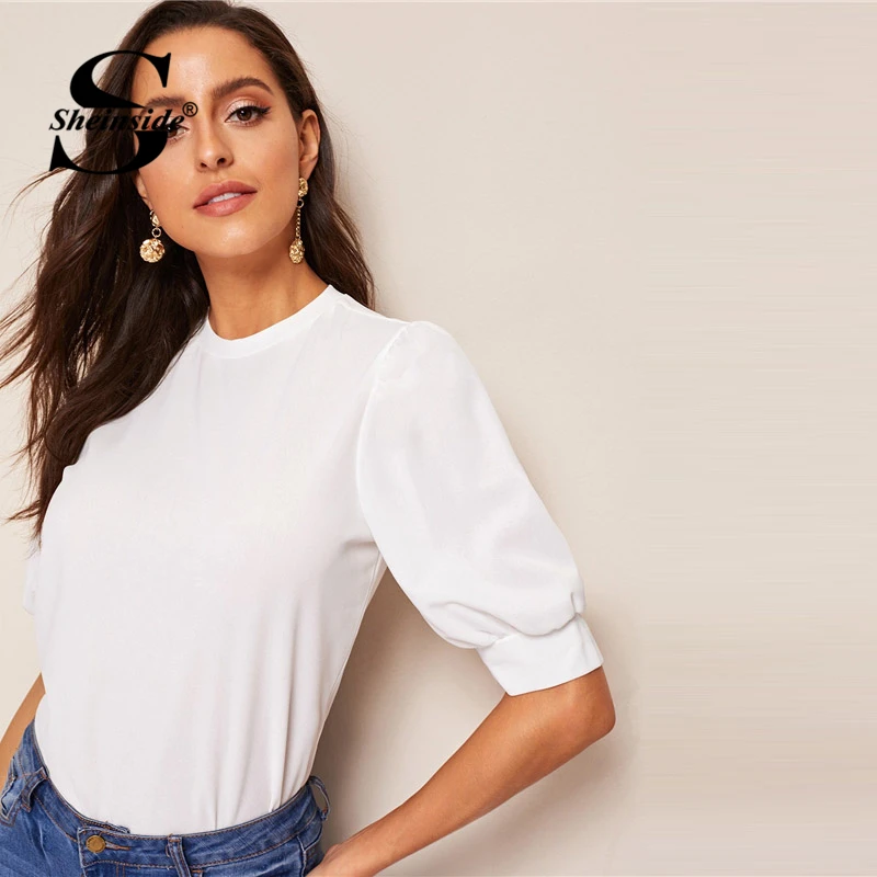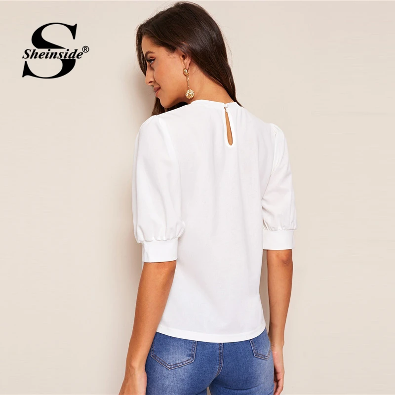 Special Offer Sheinside elegancki biały Puff rękaw bluzka kobiety 2019 lato stojak kołnierz wykończenia bluzki damskie na co dzień Cut out guzik płaski Top Discount 45% Today!