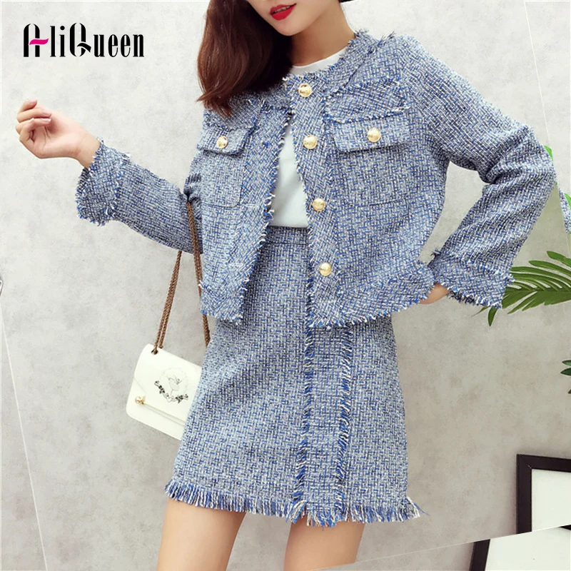 Special Offer Tweed zestaw garnitur 2019 jesienno zimowa Runway damska jednorzędowa krótka kurtka płaszcz + wysokiej talii frędzle Bodycon Mini zestaw spódnic Discount 40% Today!