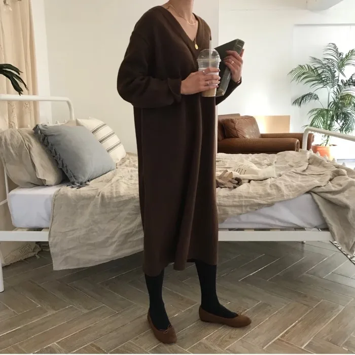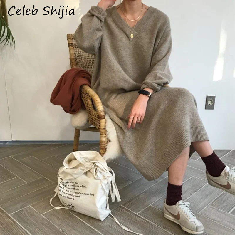 Special Offer SHIJIA w koreańskim stylu szykowny luźny zagęścić sweter maxi sukienka v neck z długim rękawem oversize utrzymać ciepłą sukienka dzianinowa kobieta jesień zima 2019 Discount 40% Today!