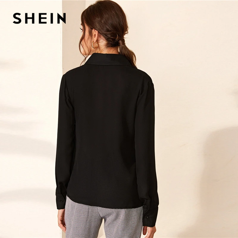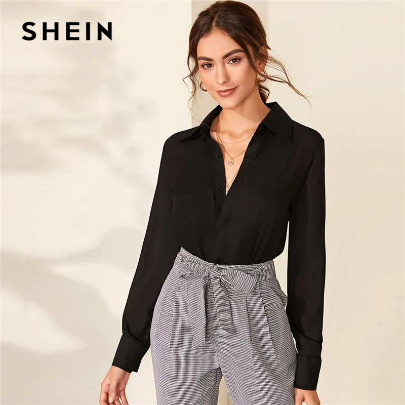Special Offer SHEIN skręcić w dół kołnierz stałe połowa plisy na co dzień bluzka koszula kobiet topy 2019 jesień z długim rękawem przycisk przodu bluzki biurowe Discount 45% Today!