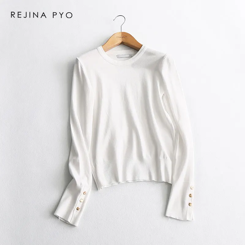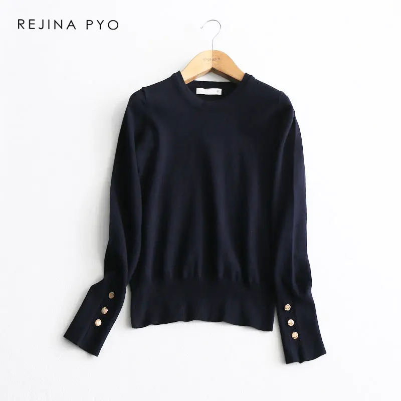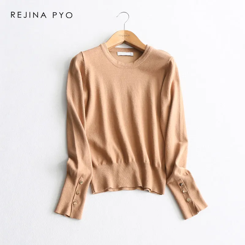 Special Offer REJINAPYO kobiety solidna w stylu basic casual O neck sweter z dzianiny mentalna zdobiona guzikami kobiece wszystkie mecze codzienne swetry swetry Discount 46% Today!