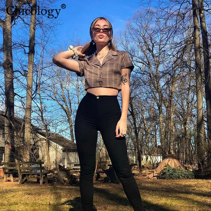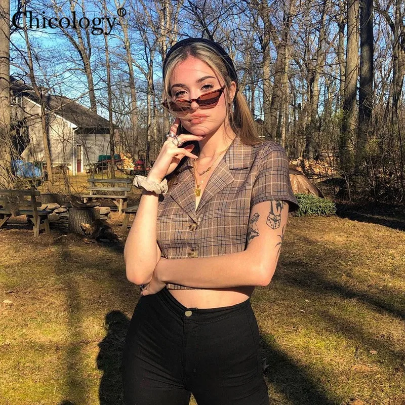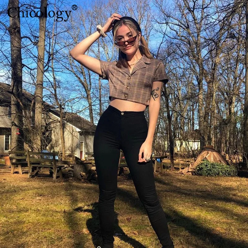 Special Offer Chicology przycisk kratę lady bluzka kobiety kpop ubrania 2019 lato kobiet sexy streetwear z krótkim rękawem casual crop top Discount 50% Today!