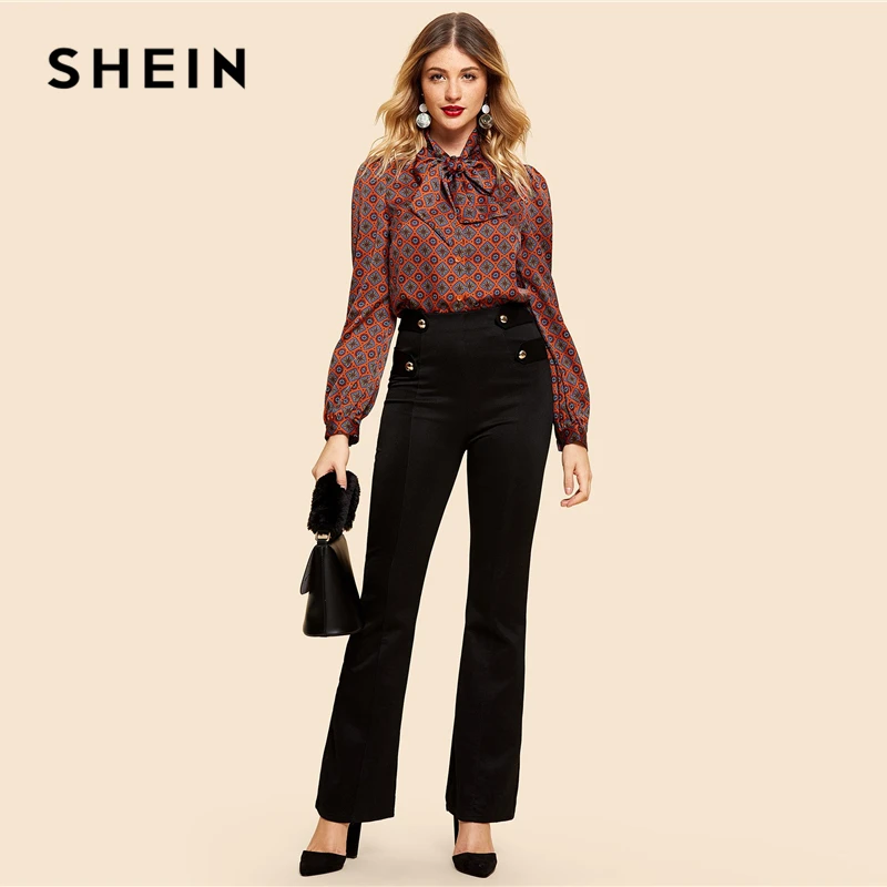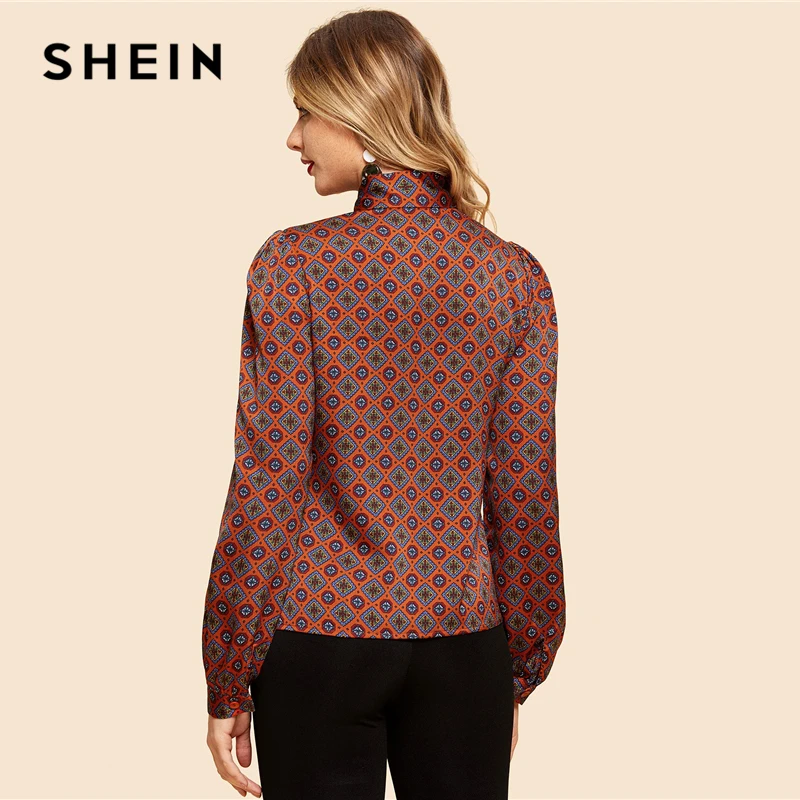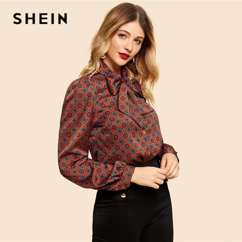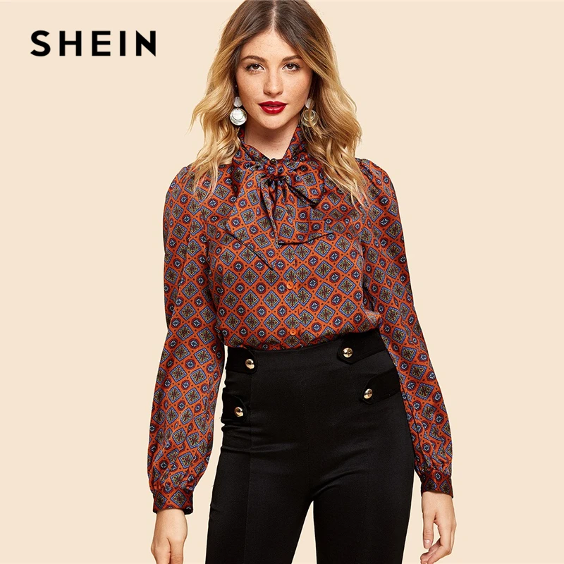 Special Offer SHEIN Rust Button Front Tie Neck Tribal Shirt Vintage eleganckie bluzki z długim rękawem kobiety odzież robocza Modern Lady jesienne topy Discount 40% Today!