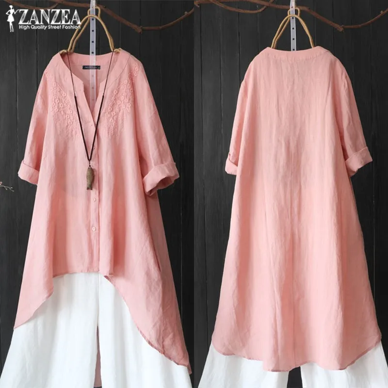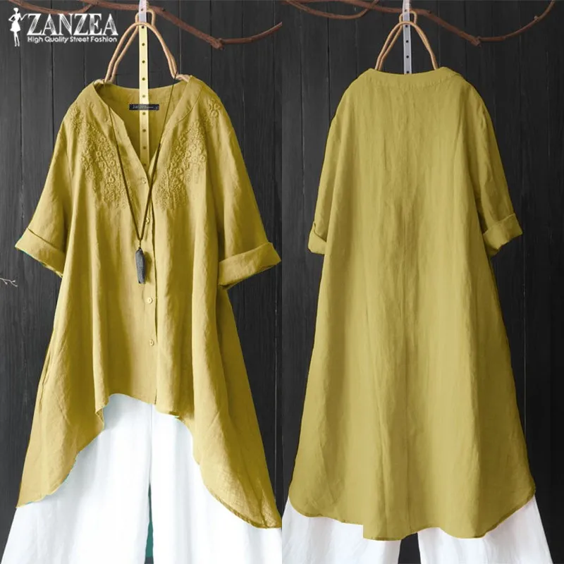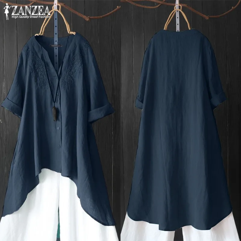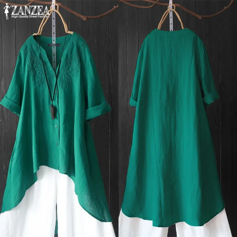 Special Offer Jesień haft bluzki damskie asymetryczna bluzka 2019 ZANZEA rocznika 3 4 z długim rękawem koszule kobiet przycisk stałe Blusas nieformalna tunika Discount 40% Today!