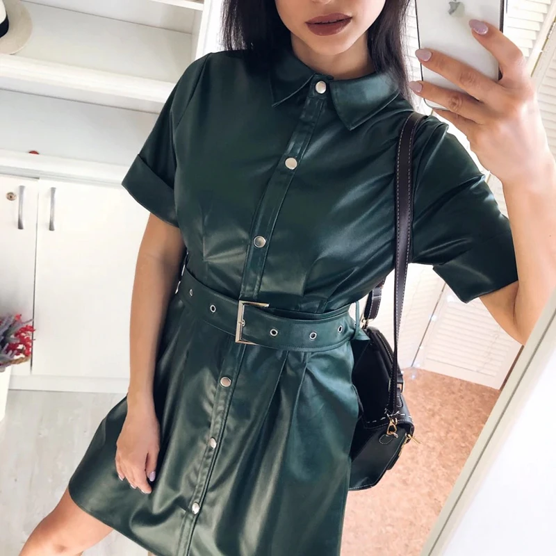 Special Offer Damskie wstęgi w stylu vintage z przodu guzik sukienka trapezowa z krótkim rękawem skręcić w dół kołnierz solidna elegancka sukienka 2020 wczesna wiosna sukienka Discount 40% Today!