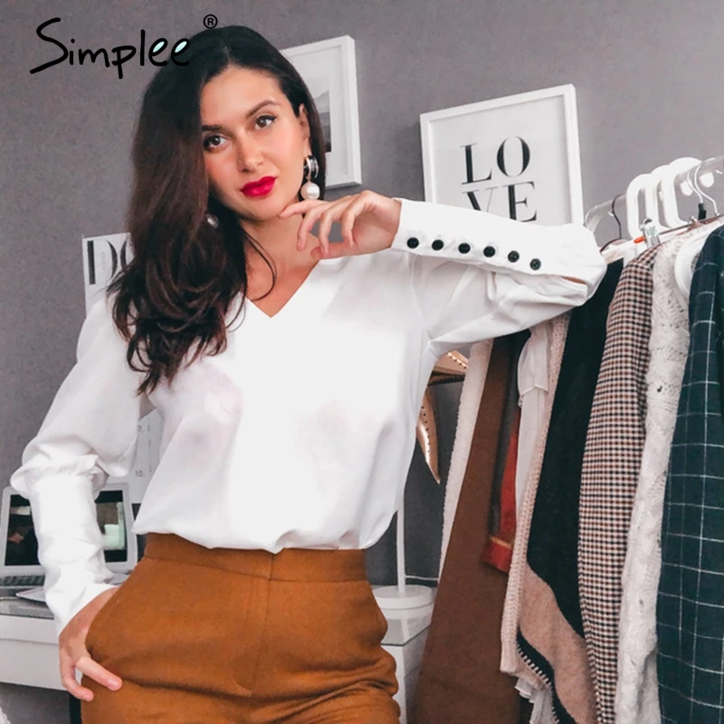 Special Offer Simplee V neck damska bluzka koszula Puff guzik na rękawie biała bluzka jesienno zimowa koszula damska top kobiecy szyfon do biura bluzka topy Discount 40% Today!